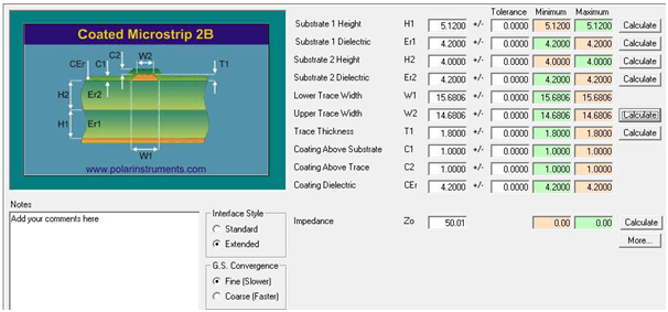 3、表層(Top/Bot層)無線周波数信号50オームインピーダンスの計算:
