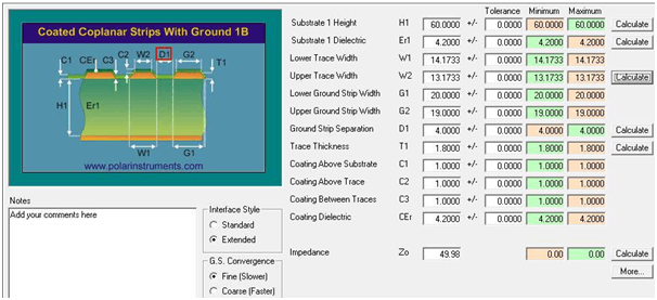 1、シングルエンド50オーム、Coated Coplanar Strips With Ground 1 Bモデルを選択し、そのインピーダンス計算方法は図7に示すように、計算構造はインピーダンス線幅14 mil、インピーダンス線から地線までの距離4 mil、地線の幅20 milである。